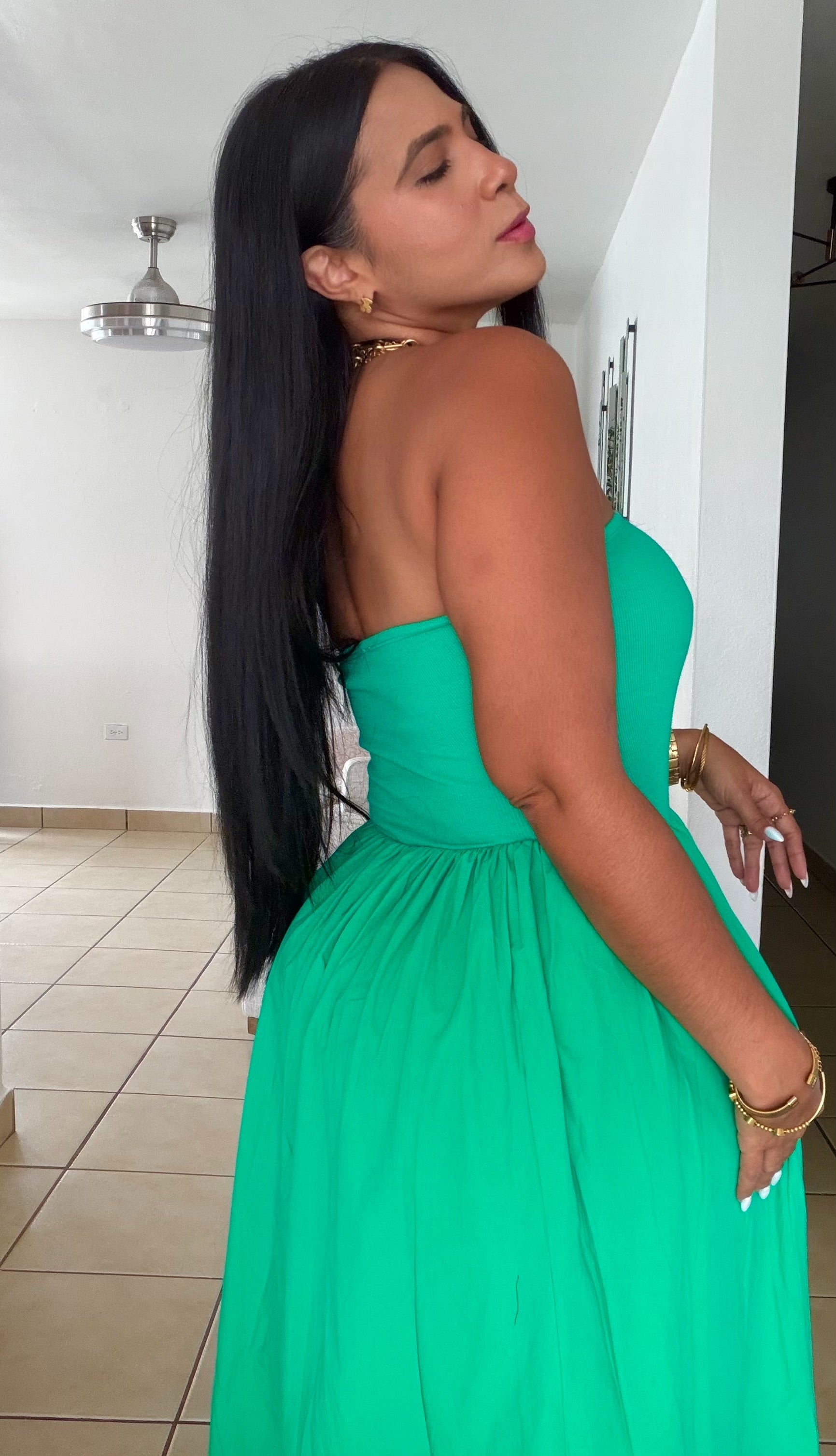 Stunning Green Tube Spandex Midi Dress (demasiado bello!!) tiene bolsillos. No zipper ni botones